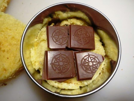 Con un coppapasta tondo di 8 cm di diametro incidere le fette di panettone tagliate con uno spessore di circa 1cm e 1/2, porre su ogni tondo 4 quadretti di cioccolato…